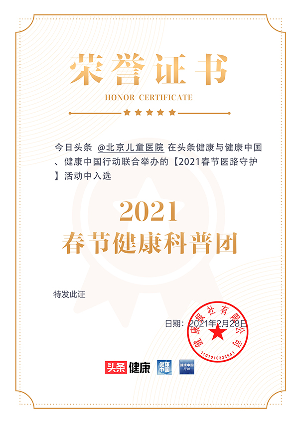 近日,在由头条健康联合健康中国、健康中国行动共同发起#2021春节医路守护#话题活动上,北京儿童医院荣获“2021春节健康科普团”荣誉称号。