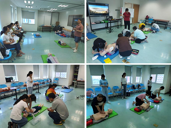 本次培训课程包括儿童、婴儿、成人(单人/双人)心肺复苏术,自动体外除颤器和球囊面罩的使用方法,以及异物窒息解除方法等内容,培训过程严格按照美国心脏协会(American Heart Association,AHA)的教学要求,采取观看视频、讲解与练习操作相结合的方式,导师通过反复教学和纠正手法,指导学员们掌握正确的基本生命支持技术。