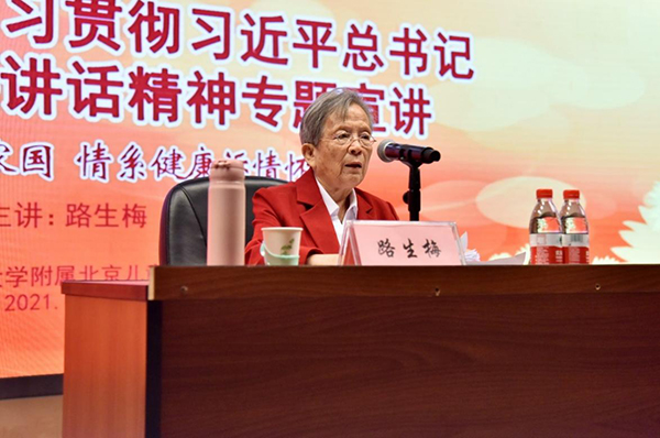 2021年8月11日下午,院党委举行学习贯彻习近平总书记“七一”重要讲话精神专题宣讲,特别邀请了路生梅老师作《普济群众报家国 情系健康诉情怀》的报告。路老师毕业于首都医科大学儿科系,是张金哲院士的学生,1968年响应祖国“建设大西北、服务大西南”的号召,扎根山城佳县,曾任陕西省榆林市佳县人民医院副院长、儿科主任。今年荣获全国优秀共产党员、全国三八红旗手称号,并受邀登上天安门城楼观礼台出席庆祝建党100周年大会。北京儿童医院党委书记张国君,专职副书记、纪委书记丁枭伟,工会主席王爱华,“时代楷模”、超声科名誉主任贾立群出席活动,部分党员、入党积极分子、团员青年、学生代表等100余人到场聆听。