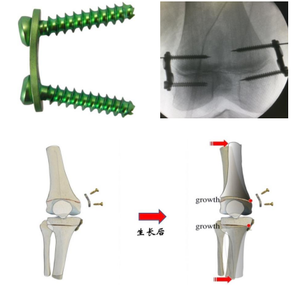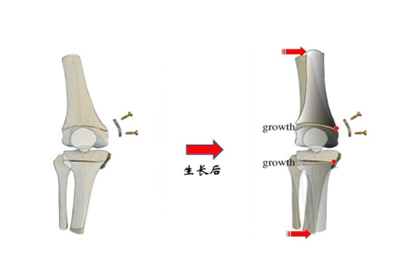 “8”字钢板手术也称为临时骨骺阻滞术或者生长引导技术,是通过在儿童下肢骨骺“生长板”的位置置入“8”字钢板而得名。这种治疗方法充分利用了儿童自身处于生长发育期、骨骺未闭合的特点,通过限制骨骺的生长,使异常生长的骨骺一侧或者两侧暂缓生长速度,而未限制的骨骺则正常生长,从而达到治疗儿童下肢成角畸形(膝内翻、膝外翻)和下肢过度生长的目的;待去除“8”字钢板后仍可恢复骨骺的生长能力。对比传统截骨矫形手术,其具有损伤小、技术难度低、并发症低等优点,得到了临床医师的广泛认可。
