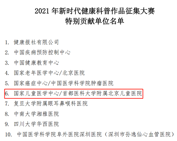 近日,由国家卫生健康委与中宣部、科技部、中国科协共同举办的“健康知识普及行动——2021年新时代健康科普作品征集大赛”公布了优秀及入围作品名单。北京儿童医院获得包括“特别贡献单位”在内的七项奖。