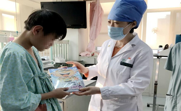 其实,小明的治疗并非一帆风顺,入院之初,来自贵州偏远山区的小明父母因担心治疗费用,对治疗有些抵触情绪;被病痛折磨的小明,情绪也很消极。得知这种情况后,重症医学科积极联系社工部为小明进行情绪疏导,并为这对父子联系了治疗间期免费入住麦当劳叔叔之家,还亲自带来书籍送给小明,缓解孩子的紧张情绪。
