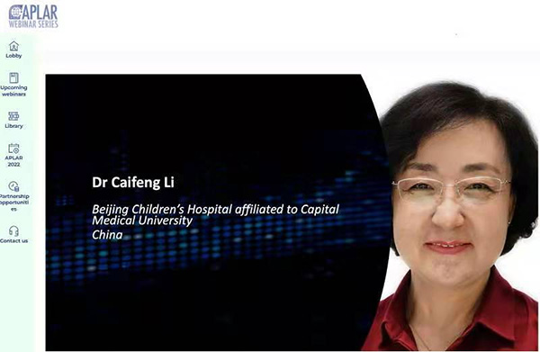 APLAR隶属于国际风湿病联盟(ILAR),由亚洲太平洋地区各国的风湿病学会组成,现在包括30个国家的风湿病协会成员,是亚太地区最有影响力的风湿病学专业机构之一,致力于在亚太地区宣传和促进风湿病学科的发展工作。2022年,APLAR儿童风湿病学组组织每月一次的网络研讨会,作为APLAR中国儿童风湿病学唯一代表,李彩凤教授受邀发言。在与国外同行交流的同时,彰显了北京儿童医院作为国家儿童医学中心的实力。