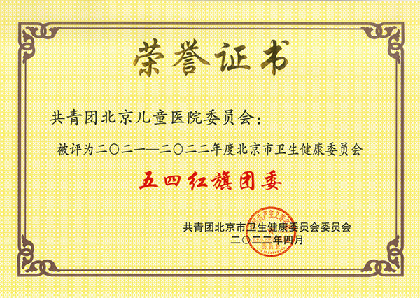 继北京儿童医院五官团支部荣获“北京市五四红旗团支部”后,在2021—2022年度市卫生健康委“两红两优”评选中,我院检验团支部、五官团支部荣获“北京市卫生健康委员会五四红旗团支部”称号;团委委员、急救团支部书记张薇,五官团支部书记修冰玉荣获“北京市卫生健康委员会优秀共青团干部”称号;急救团支部副书记王聪、泌尿超声团支部副书记刘晓晨、呼吸影像团支部宣传委员王帅、五官团支部组织委员赵涵荣获“北京市卫生健康委员会优秀共青团员”称号。