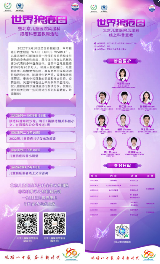 除了直播活动外,科普宣教周期间,科室微信公众号“北京儿童医院风湿科”也连续发布系列狼疮科普文章,还将就患儿家长提出的问题在公众号上逐一答复推送,也将会把直播中精彩授课内容进行线上分享。