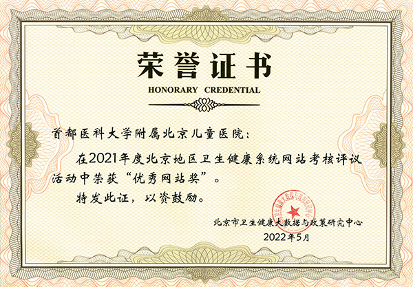 北京儿童医院网站荣获2021年度北京地区卫生健康系统网站“优秀网站奖”