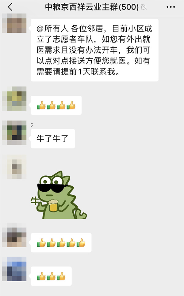 “各位邻居,目前小区成立了志愿者车队,如有外出就医需求,我们可以点对点接送方便您就医,如有需求提前一天联系我。”在中粮·京西祥云的各个业主群里,这样一条信息被不断转发。